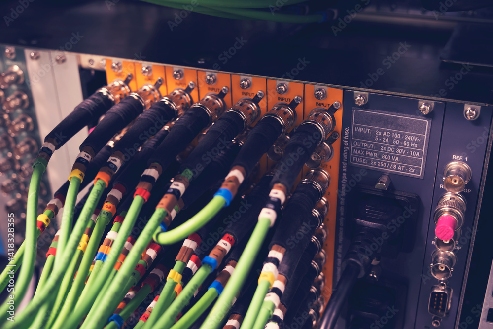 Connecting BNC connector for CCTV system. Broadcasting system room.