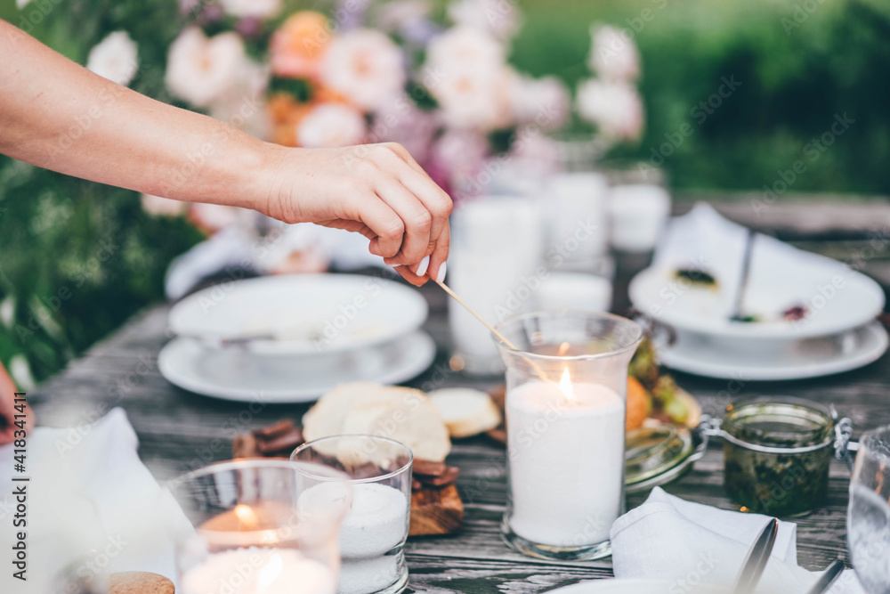 women ignite fire to decorative candles in stylish glass holders with thin wooden sticks at rustic table with elegant setting in garden closeup.