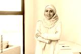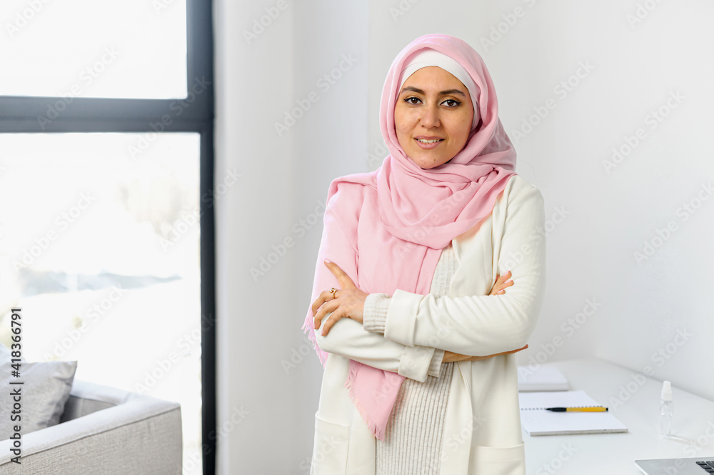 Confident modern islamic woman wearing pink national hijab and smart casual wear standing with arms folded in bright office space, corporate portrait of muslim businesswoman indoor, diverse employee