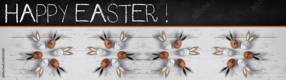 Happy Easter background banner panorama greeting card - Top view from white and brown painted cute funny easter eggs with bunny ears / Easter bunny, on white rustic vintage shabby wooden table texture