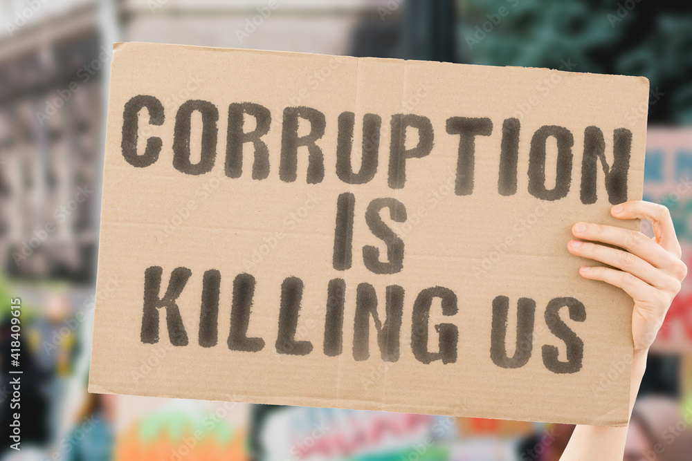 The phrase " Corruption is killing us " on a banner in hand with blurred background. Protest. Street. Strike. Outdoor. Government. Power. Money. Steal. Stealing. Theft. Offence. Criminality. Dishonest