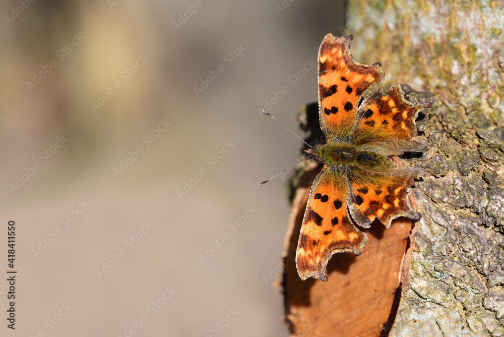 Close-up of a C-butterfly (Polygonia c-album), an orange colorful butterfly that sits on a tree trunk in spring and sunbathes with space for text