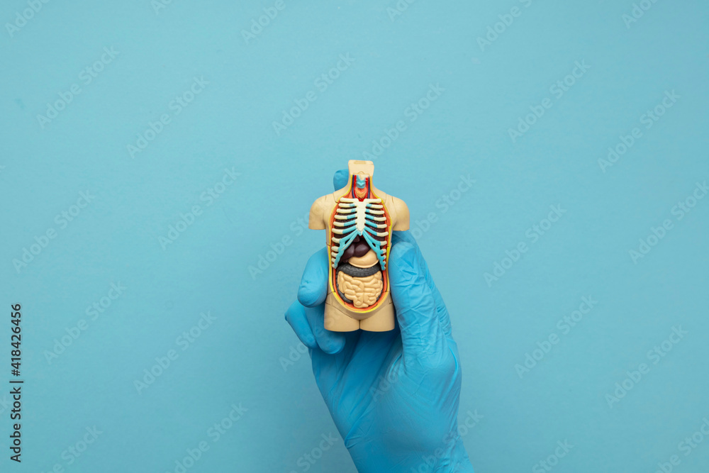 Doctor wearing blue surgical gloves holding an anatomical model of a human body