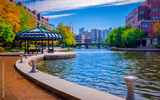 Pavillion and Pond. Autumn Landscape of Lechmere Canal Park in Boston