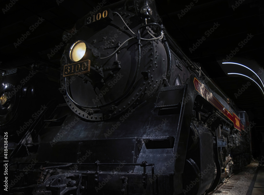 Massive black vintage steam locomotive at railway platform headlight on at night nobody