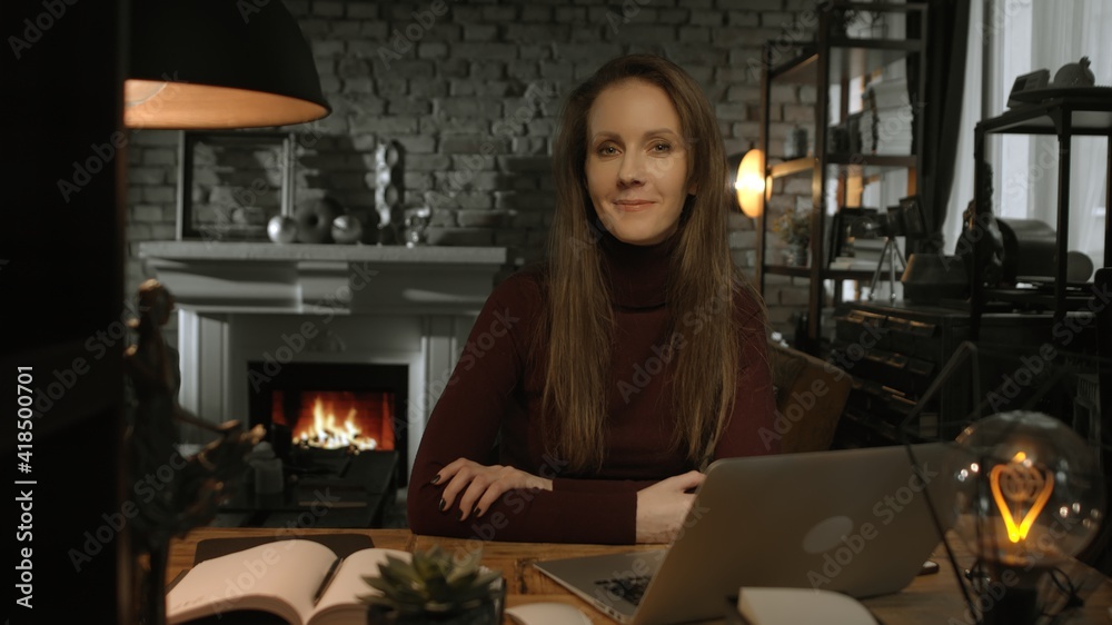 Home office - white woman working from home with laptop computer. Sitting at desk in dark living room in front of fireplace in Winter.