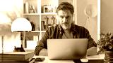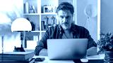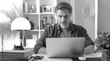 50s businessman with gray hair working from home. Man in casual sitting at desk using laptop computer, business manager online in home office.