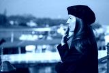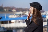 Portrait of french woman outdoor in coat and cap smoking cigarette in sunlight.