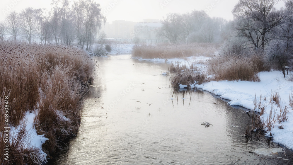 Amazing winter landscape in the public park. Scenic view of the river and reflection of frosty trees in the water. Panorama nature image. Selective focus.