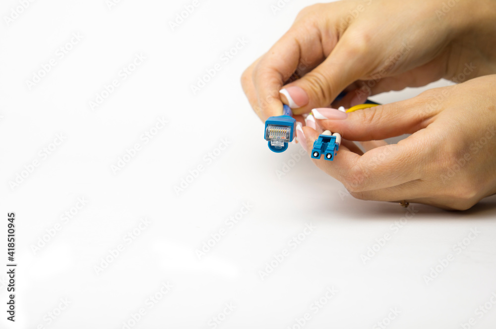 The hand holds the Internet cable to connect to the switch. Internet connection concept. Free space for text. Cable with a connector for providing communication services.