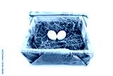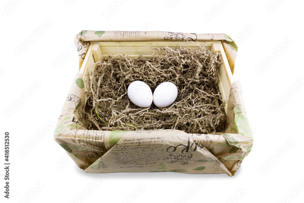 Two white eggs in paper-wrapped box, isolated on white.
