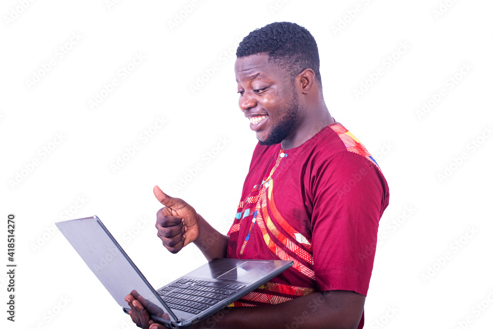adult man having video call on laptop.