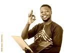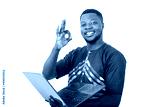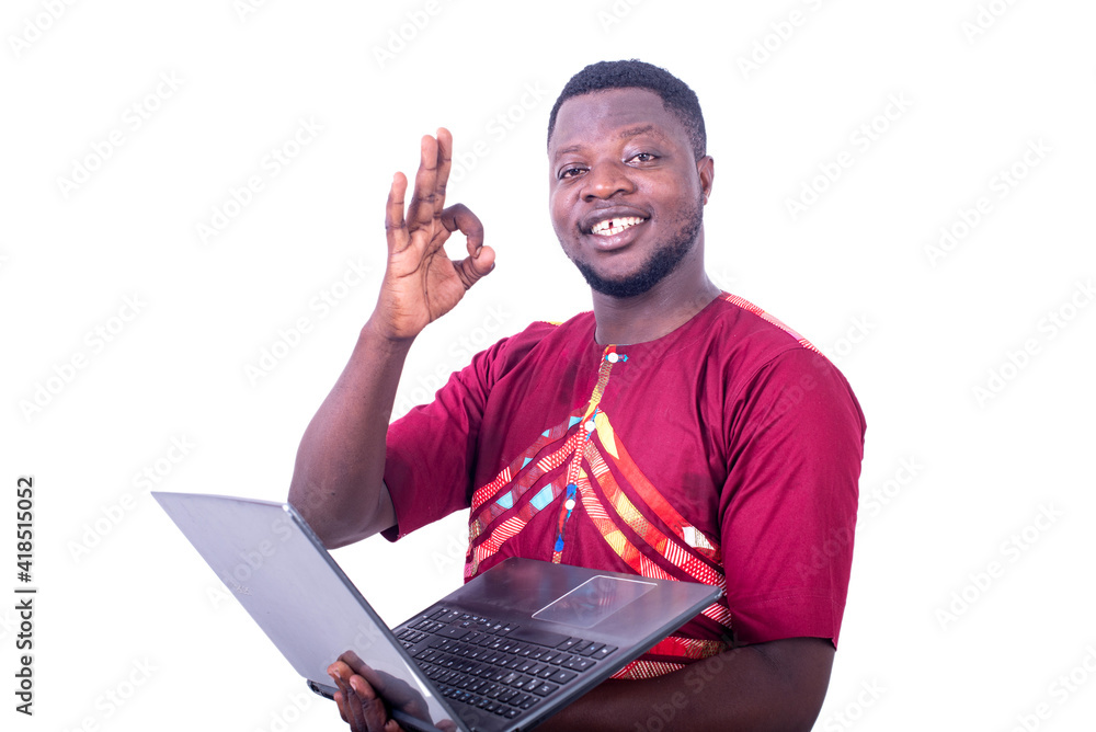 handsome adult man holding a computer and making a correct gesture.