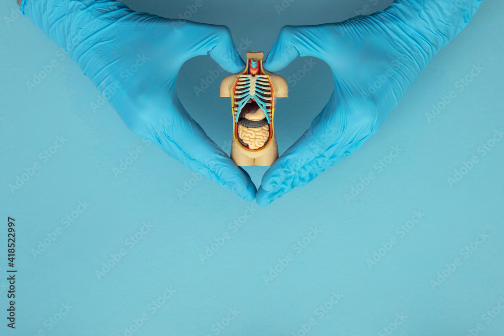 Doctor wearing blue surgical gloves holding an anatomical model of a human body