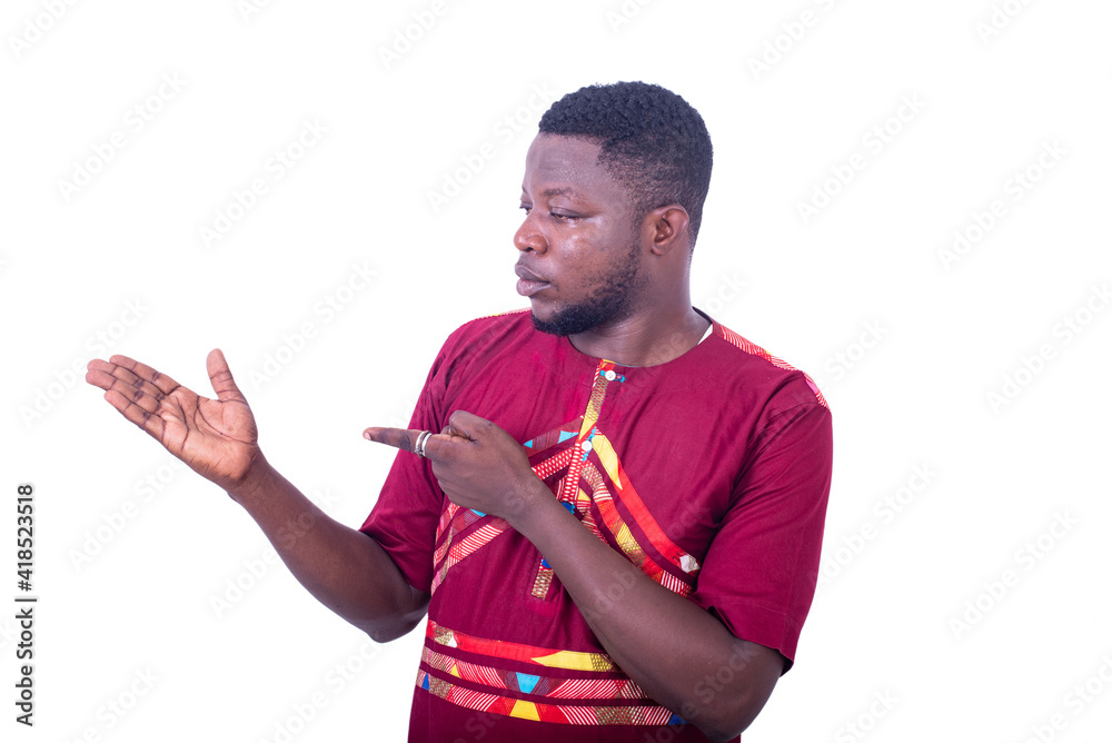 handsome young man pointing finger to empty open hand.