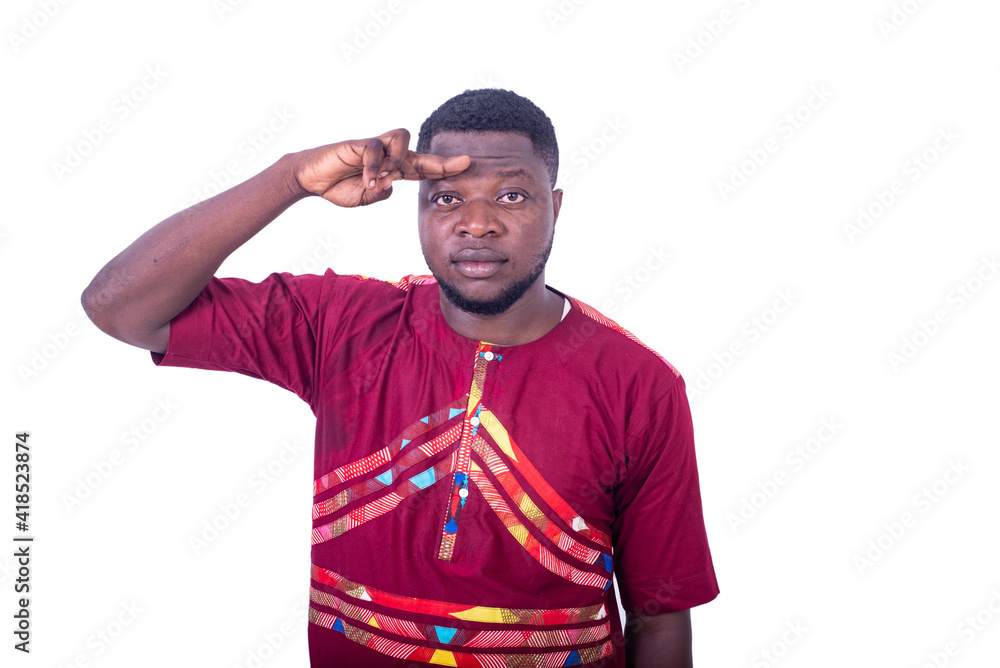 handsome young man pointing finger to forehead.
