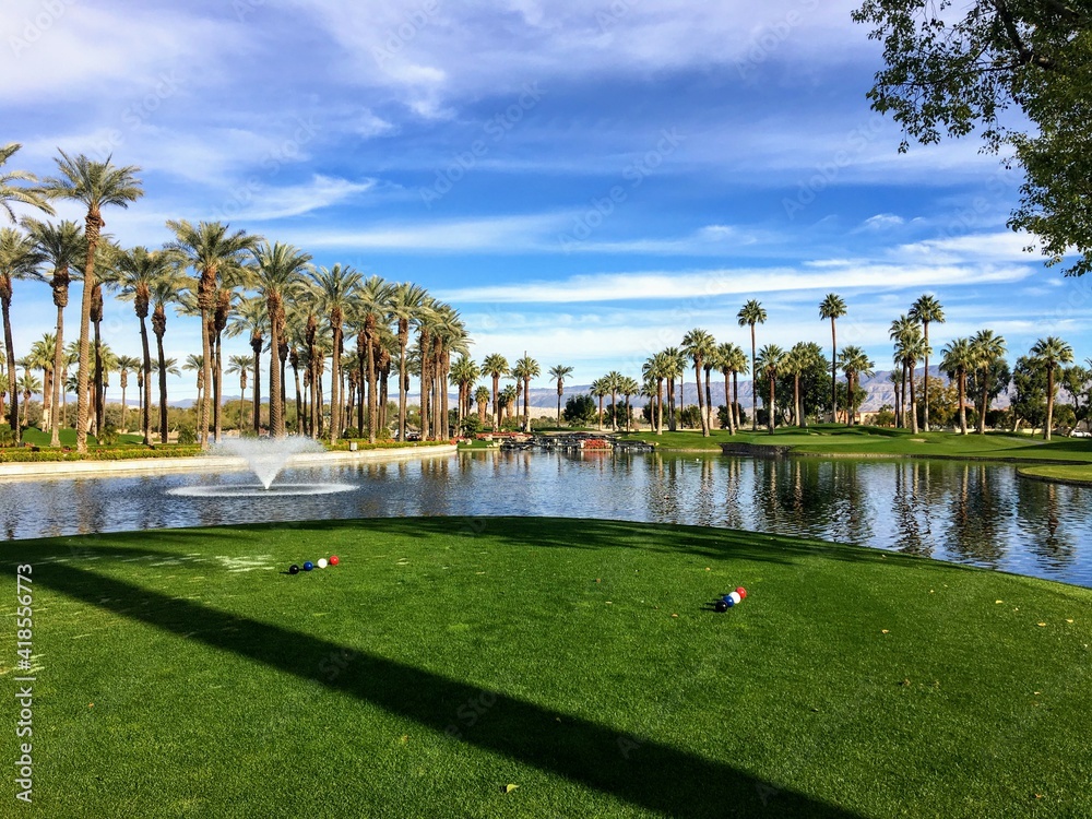 A beautiful view from the tee box of a difficult par 3 that requires a shot over the water onto an island green. Palm trees are behind the green and reflect on the water. Great golf in Palm Springs.