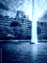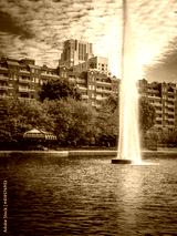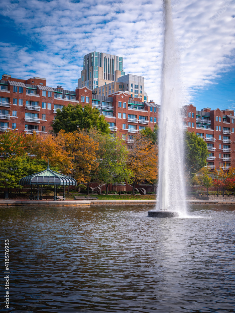Harmony of Buildings and Nature at Lechmere Canal Park in Boston. High Rising Water Fountain and Pavilion over the Water.
