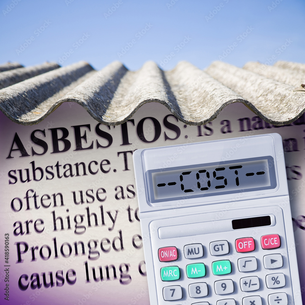 How much does it cost to remove asbestos? - Asbestos removal costs concept image with a dangerous asbestos roof panels and calculator.