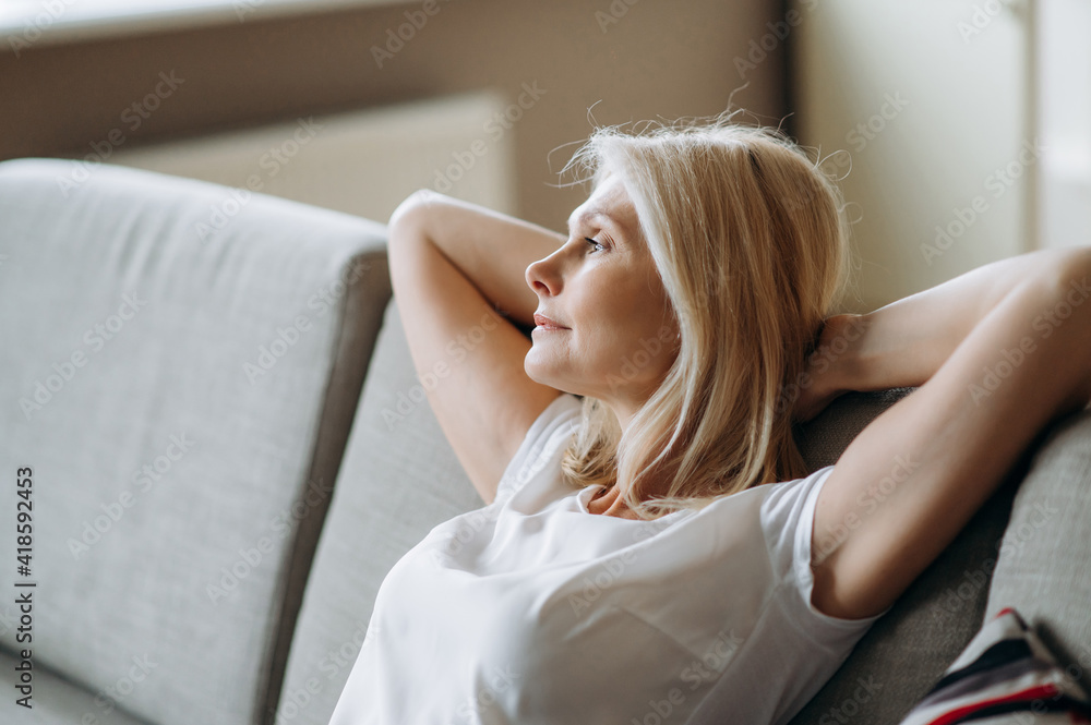 Satisfied mature caucasian woman is relaxing on the sofa at living room at home. Middle aged blonde woman enjoying weekend or leisure, sits on sofa, looks away and dreams about vacation