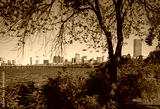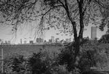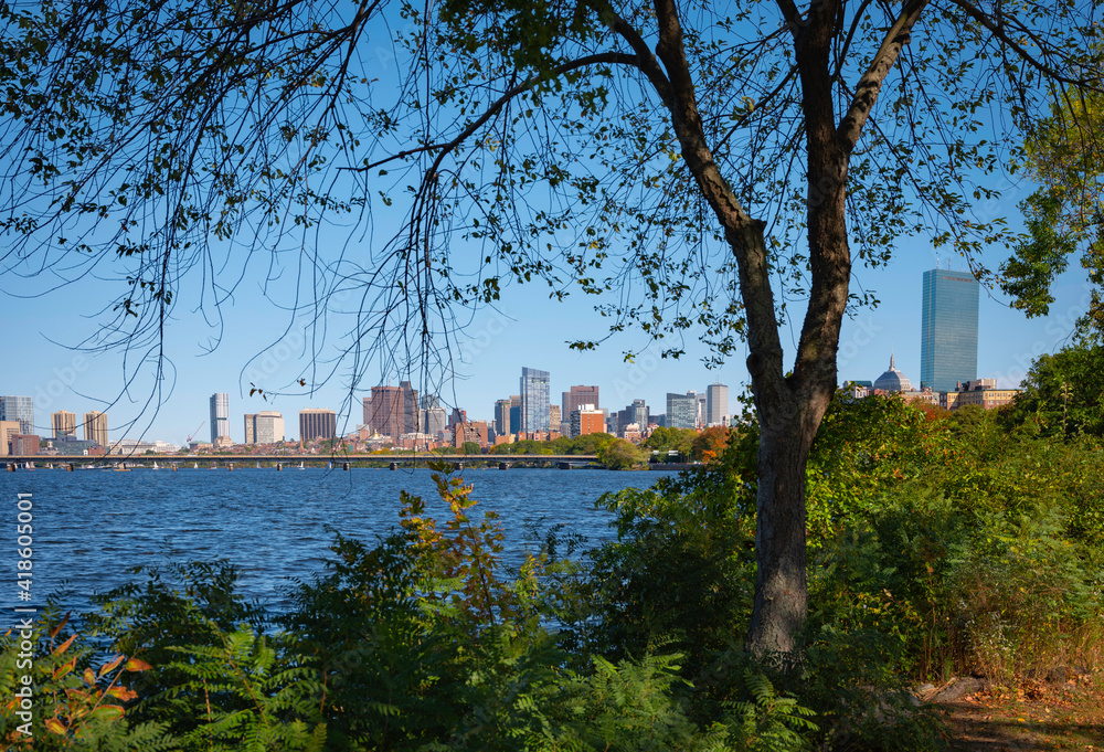 Boston Cityscape over the Charles River Seen from Behind Trees