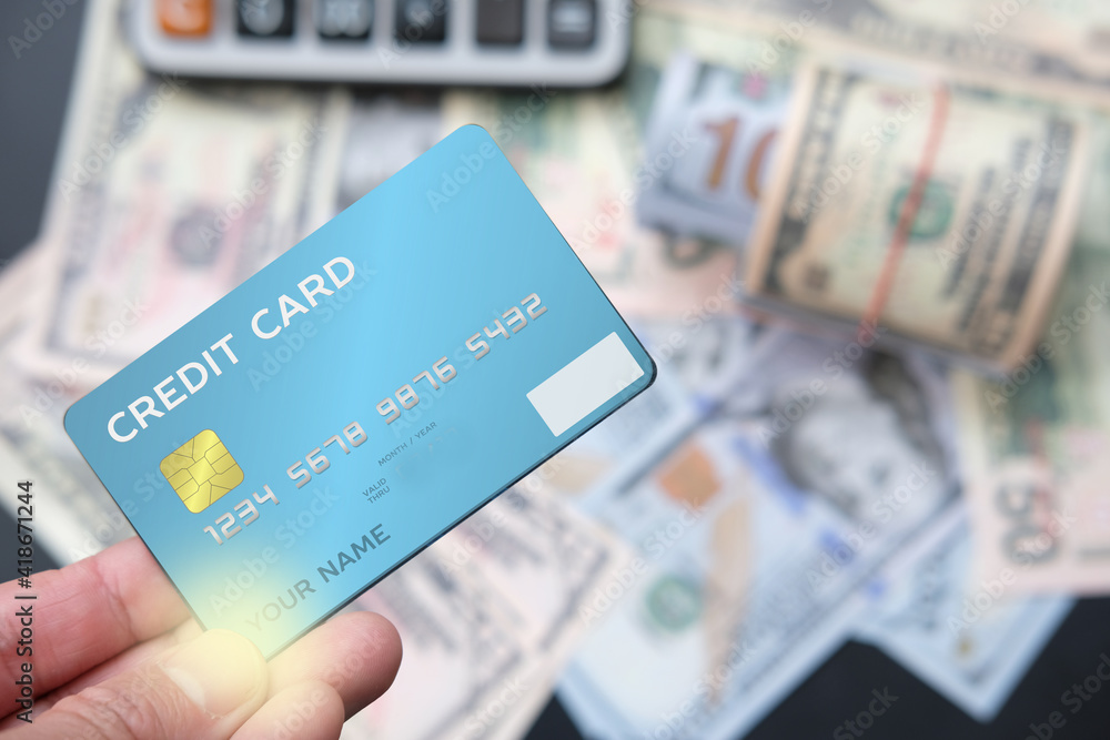 Holding credit card, Savings money and income Investment ideas and financial management for the future, Advertising banknote of finance and banking