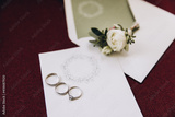 Wedding details. The rings of the bride and groom lie on a white invitation card and an envelope, next to it lies a boutonniere of white flower and greenery
