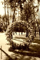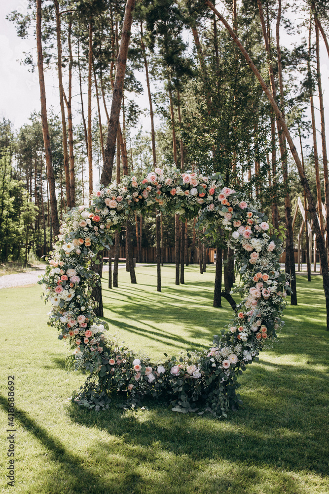 Wedding ceremony. On a green meadow in the forest there is an arch of flowers and greenery, next to there are wooden chairs for guests