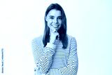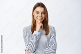 Very good. Thoughtful young woman nod in approval and smiling, looking determined and satisfied, standing pensive over white background