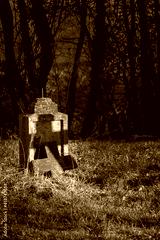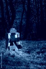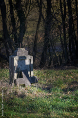 Old tombstone with broken cross but with a shadow in cross shape under trees in an abandoned cemetery, religious symbol, copy space