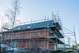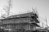 Close up view building under construction on blue sky background. Industry concept. Sweden.