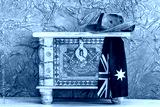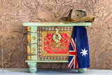 stylish pirate treasure chest with travel hat and australian flag, adventure and travel concept