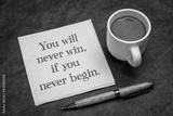 you will never win if you never begin inspirational reminder - handwriting on a napkin with a cup of coffee, business, education and personal development concept