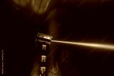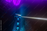 Wooden observation tower against lighted sky at night