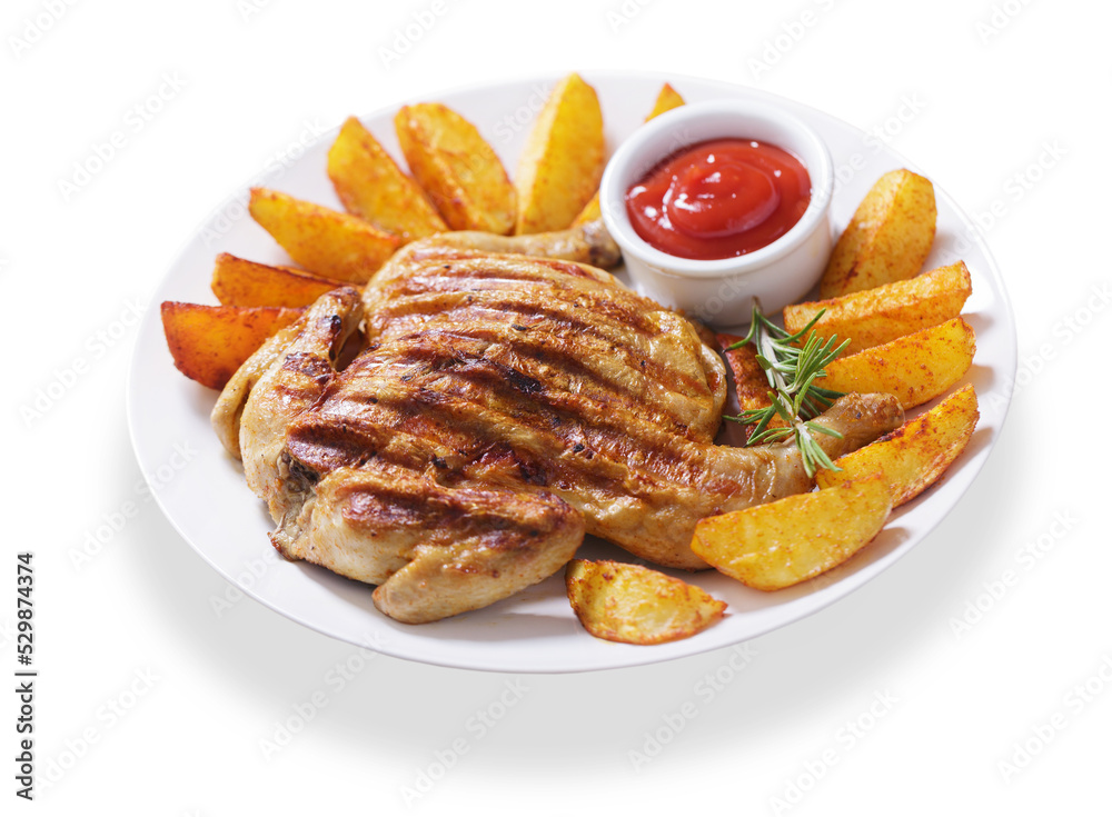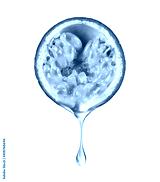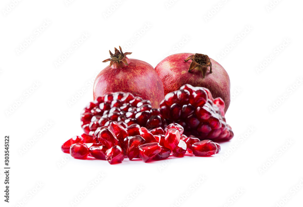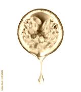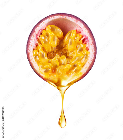 A drop of juice drips from half a passion fruit closeup isolated on white background