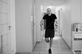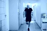 Handsome athlete on crutches with a broken leg. Injury, rehabilitation.