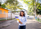 Portrait of a young college girl holding folders and notebooks and walking down the street to go to school or college. Student girl smiling and happy.