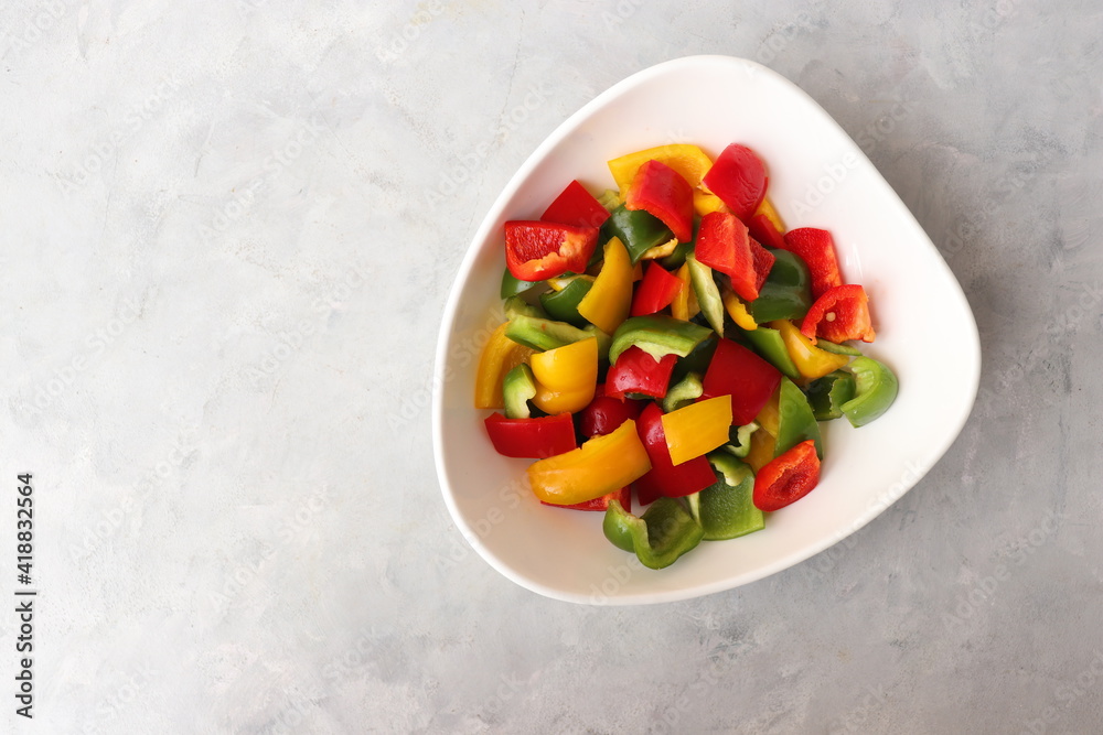 Fresh raw yellow, green, red bell peppers, and onions placed in a white bowl. Diced colorful capsicum. chopped colorful veggies for Chinese preparation. Healthy vegetable background with copy space.