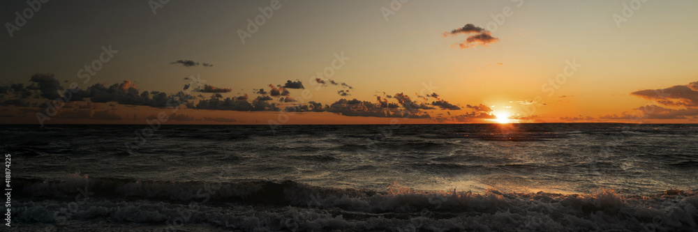 Waves in the sea with sunset as a panorama