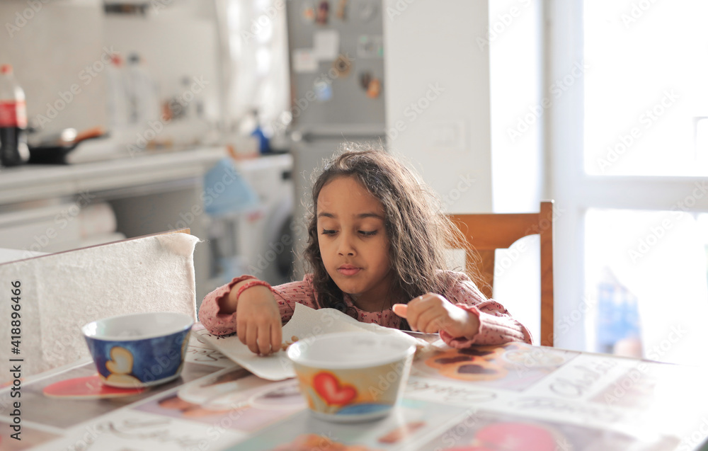 little girl has breakfast on the table in the kitchen