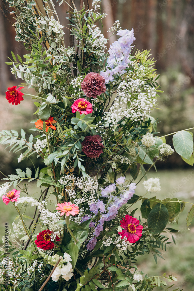 Wedding decorations. Floristics. Composition of flowers and greenery in the area of the wedding ceremony