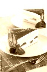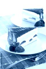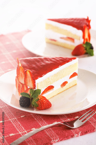 A piece of strawberry cake with cream and strawberry put on white dish are decorated on dining table.