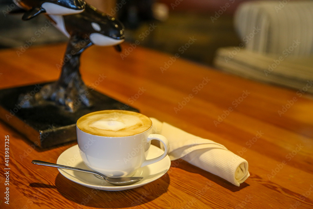 Tofino, British Columbia - March 8, 2018: A latte at the Wickaninnish Hotel in Tofino British Columbia