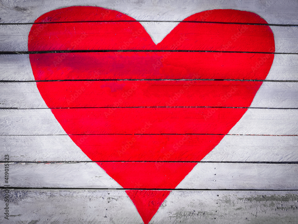 Heart in Red painted on the White Wooden Pallet. Graphics for love, heart, warmth, kindness, care, cheer-up on white background with lines