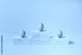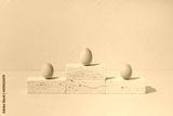 Three eggs standing on a travertine marble podium on a beige and gray background. 2021 Easter unique still life composition. Surreal retro creative scene. Minimal competition concept.