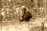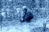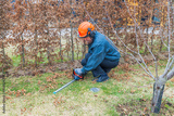 Close up view of man in garden preparing bush cutting electrical machine for work. Sweden.