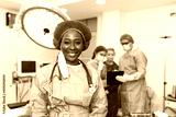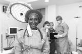 Close-up of a African American surgeon woman looking at camera with colleagues performing in background in operation room. The concept of medicine