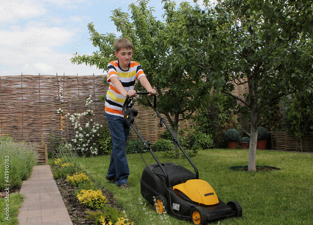 Teen boy mows the lawn mower electric