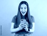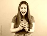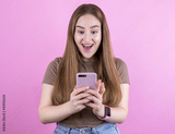 Portrait of surprised crazy blogger girl using mobile phone and getting notification on social network. The look screams wow god wears a brown t-shirt on a pink background.