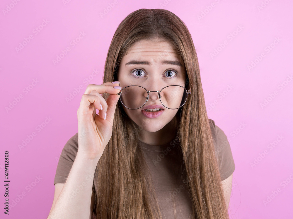 Amazed excited girl hears terrible quarantine news about coronavirus, takes off glasses down, shifts with hand and looks at camera isolated on pink background